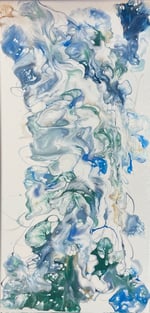 "LifeFlow" is proof of what exists after Heaven and Earth come together in Divine order! This inventive artwork lives on a 10x20 inch canvas, floating in beautiful hues of deep green, blue, white, and gold, protected in a light coating of Liquitex high gloss varnish to bring a celestial atmosphere to your home!